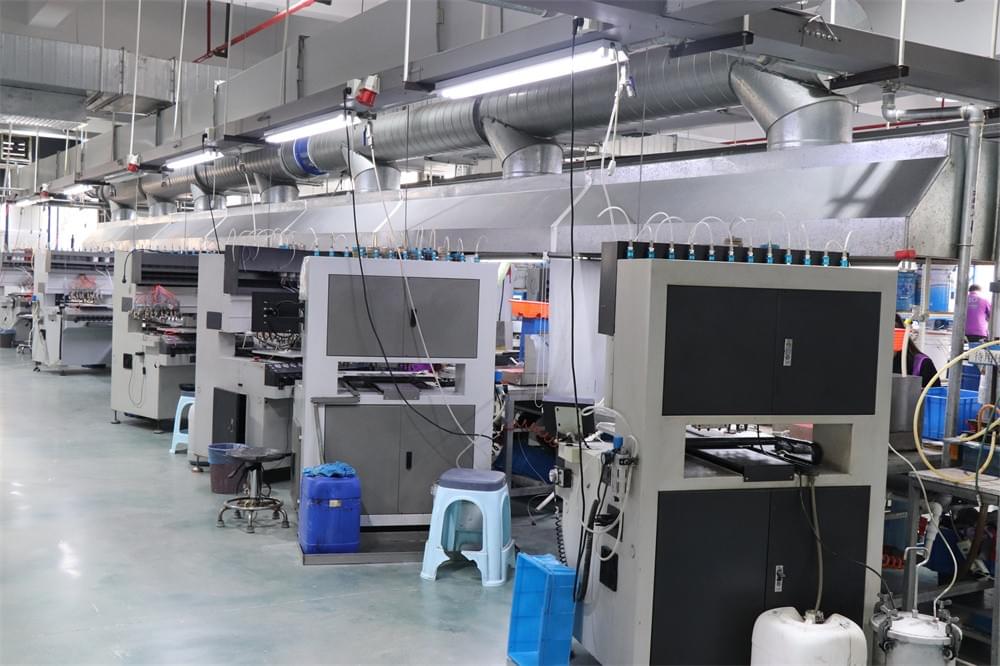 • The printing workshop supports the printing processes for the injection molding, drip molding, silicone, leather, and zipper workshops, covering techniques such as paint dotting, screen printing, pad printing, and glue dispensing .